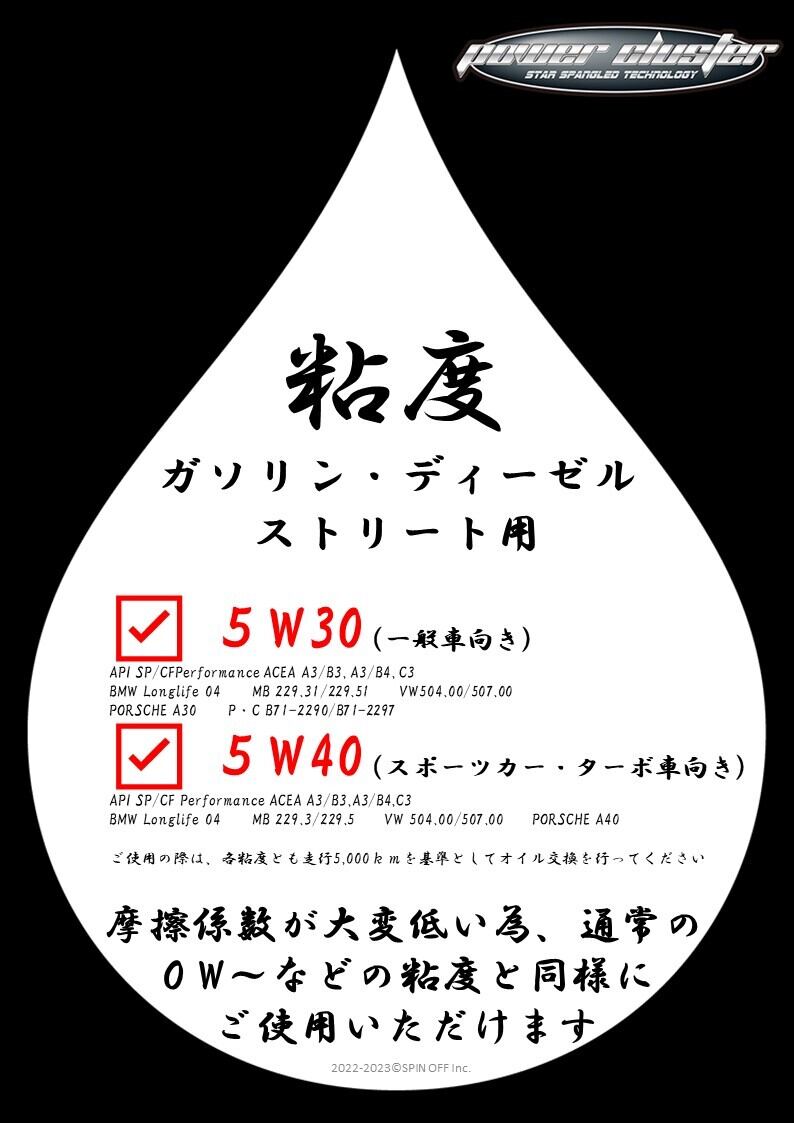 ベースオイルは、POWER CLUSTER独自の技術であるオイル分子細分化技術により高い密閉性を誇ります。オイルシールの攻撃性にも配慮しながら性能を引き出す為に、こだわりの数種類のエステルとPAOをベースにしています。さらに、添加剤との親和性を考え、アルキルナフタレン、高性能GⅢ基油を使用しています。
